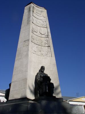 Three bronze figures on the monument represent different periods: an Old Russian warrior, a medieval architect, and an industrial worker of modern times.