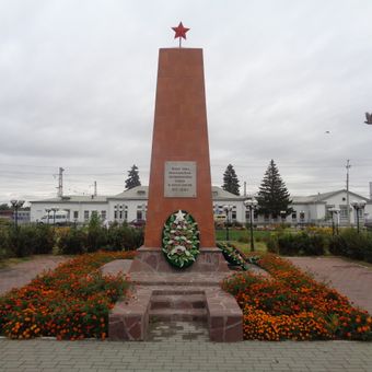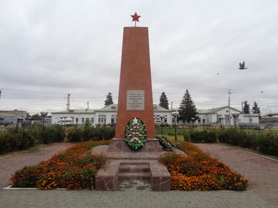 Памятный знак на месте подвига машиниста паровоза А.Г. Мотова, сбившего 13 июня 1918 года своим паровозом бронепоезд белочехов (Троицк)