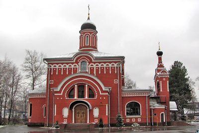 The Holy Trinity Church stands within the city limits of Khimki, featuring traditional Russian Orthodox architectural elements with a central dome and bell tower.
