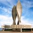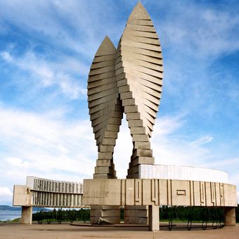 The memorial features two concrete flame petals and curved steles with marble plates displaying names of fallen soldiers from World War II.