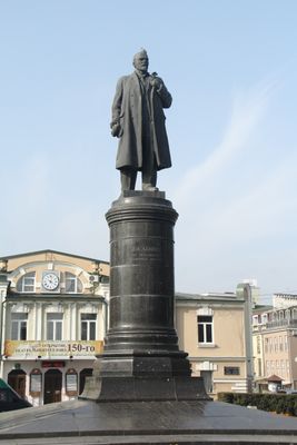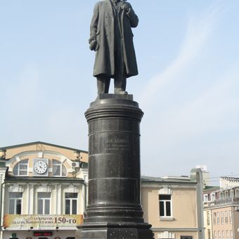 The monument represents a significant federal cultural heritage site, surrounded by the Vakhtangov Russian Theater and the former Public Assembly building.