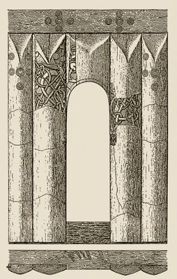 Hemse stave church was originally a wooden structure built with load-bearing oak posts and decorative details that were later incorporated into the replacement stone building. The construction consisted of upright wooden stakes forming the walls, a building method common in medieval Scandinavian architecture.