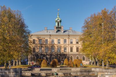 The town hall stands in central Gävle with a traditional facade, large windows, and multiple administrative offices spread across its floors.