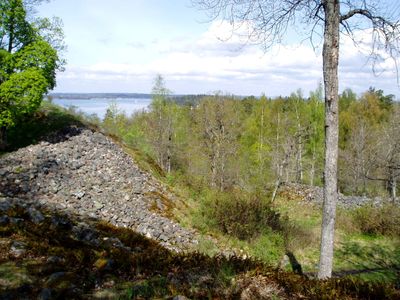 The fortress stands on steep cliffs rising 45 meters above Lake Mälaren, featuring two stone walls constructed without mortar on its land-facing side.
