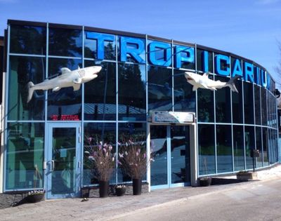 Kolmarden Tropicarium is a tropical animal exhibition building with multiple zones displaying aquatic life in large tanks. The facility includes both freshwater and marine aquariums housing sharks, fish species, and other tropical creatures across its different sections.