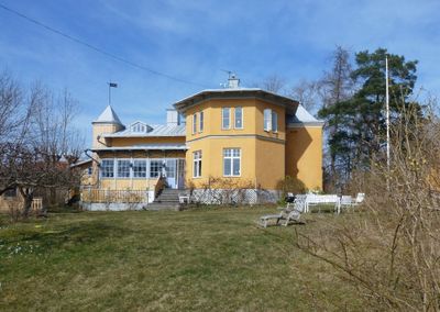 Villa Akleja is a large wooden residence in Vaxholm featuring a two-story studio with a glass roof and northern windows that open onto an expansive garden. The complex includes nine rooms, six bedrooms, and two separate guest houses distributed across the sprawling grounds.