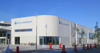 Hylliebadet contains multiple swimming areas including a 50-meter pool, training pools, and family sections with water slides across 11,500 square meters of space.