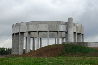 The Filborna Water Tower features a circular tank with a 90-meter diameter, supported by 24 concrete pillars reaching 27 meters in height.