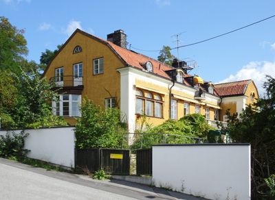 The place sits in a Stockholm suburb where locals enjoy access to water views and woodland paths typical of this region. The setting reflects how Swedish suburban communities blend residential comfort with natural surroundings.