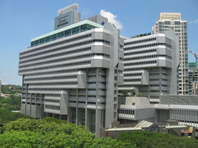 The structure represents Singapore's architectural evolution, incorporating Brutalist design elements with concrete materials and rectangular ceramic tiles across its facade.