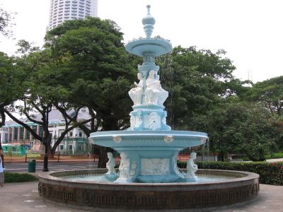 Tan Kim Seng Fountain is a three-tiered cast iron fountain in Downtown Core, Singapore, featuring classical sculptural elements. Four Greek Muses and water-spouting Poseidon heads decorate the structure, giving it ornamental detail throughout its height.