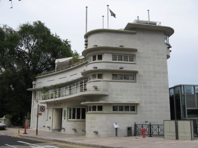 The Fullerton Waterboat House is a curved facade structure with three stories located near Marina Bay in downtown Singapore. It features a distinctive semi-circular tower visible from Fullerton Road and now houses multiple restaurants with water views.