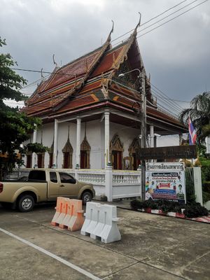 The main hall of Wat Thephakon displays traditional Thai Buddhist architectural elements with detailed decorative features and religious murals on its walls.