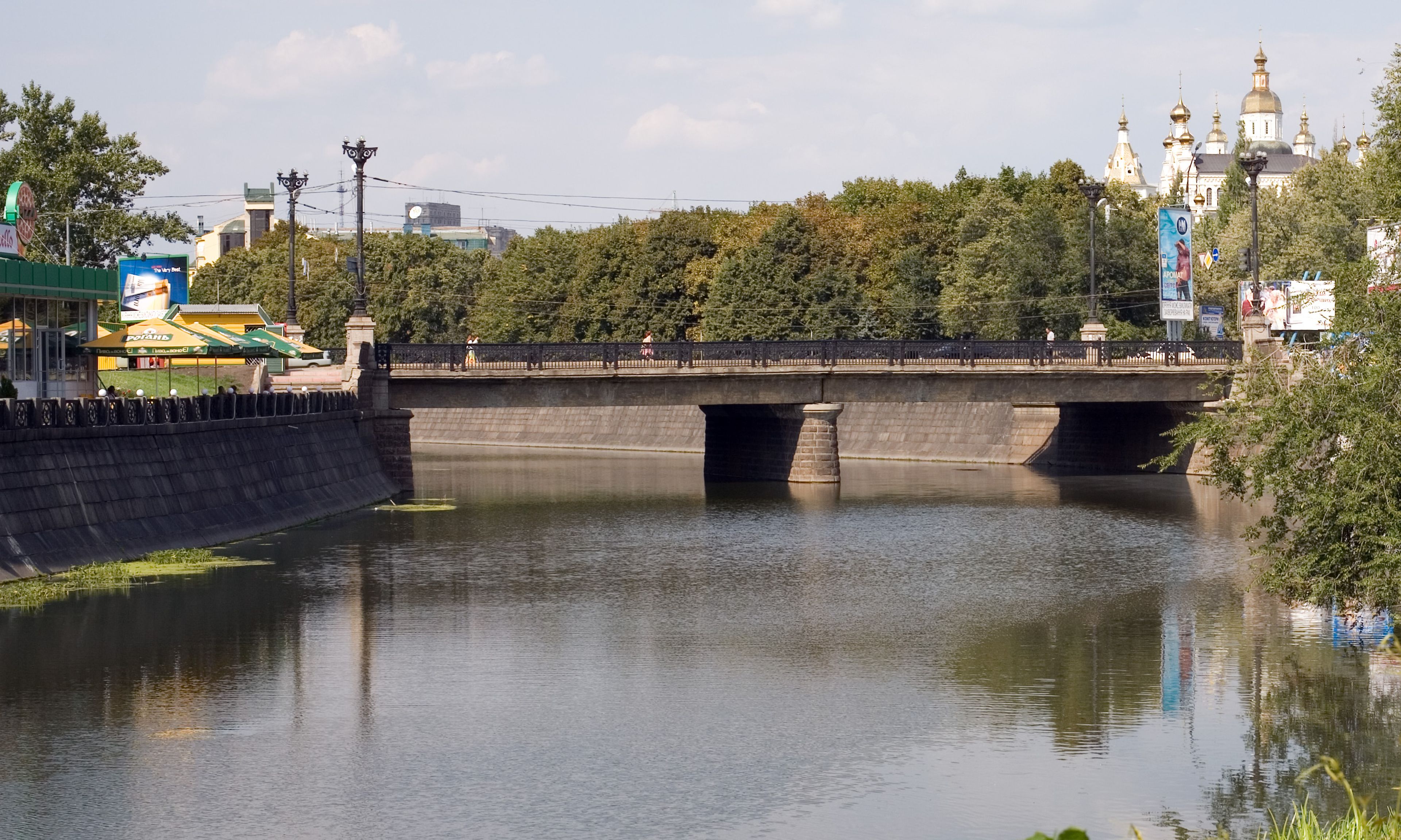 The Lopan Bridge spans across the Lopan River with multiple lanes accommodating regular traffic flows through the center of Kharkiv.