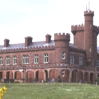 Kinloch Castle is a red sandstone mansion on Rùm island featuring Tudor-style architecture and formal gardens surrounding the estate. The building contains preserved Victorian rooms with original furnishings and historical objects from its period.