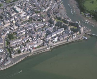 The town stretches along the eastern shore of the Menai Strait, featuring stone walls that extend for 734 meters with eight defensive towers.