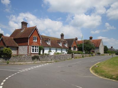 A 13th-century thatched barn behind the church, among the largest medieval structures in Sussex, stored corn for Lewes Priory monks.
