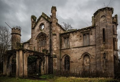 Cambusnethan House, Gothic Revival mansion ruins in North Lanarkshire, Scotland.