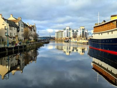Leith is a port district in northern Edinburgh where the Water of Leith meets the Firth of Forth and cargo ships plus ferry connections dock. The area stretches from the old harbor basin to the modern Ocean Terminal, with brick warehouses lining the quays and residential blocks in former industrial buildings.