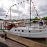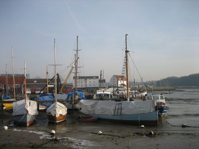 The River Deben flows through Woodbridge, creating a natural harbor where vessels navigate beside the centuries-old structures and waterfront buildings.