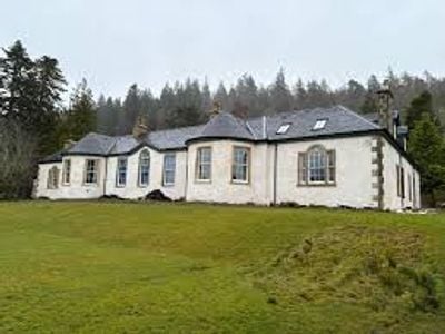 The eastern shore of Loch Ness features this stone manor with traditional Scottish architectural elements and symmetrical windows spanning multiple floors.