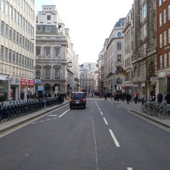 Cheapside is a wide through road in the City of London financial district, running from the area around St. Paul's Cathedral to the junction at Bank. The route passes modern office buildings, shops and restaurants housed in facades from different building periods.