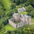 The fortress stands on an elevated position near the River Teith, featuring a central courtyard, a great hall, and two principal towers connected by stone walls.