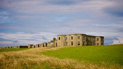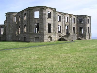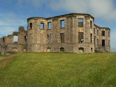 Downhill House stands as an impressive neo-classical mansion ruin perched dramatically on clifftops overlooking the Atlantic Ocean, featuring curved wings with domed ends and granite ashlar facades adorned with Corinthian pilasters.