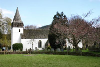 The whitewashed stone church stands on the banks of the River Wye, featuring a nave, chancel, vestry, west tower, and north and south porches.