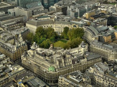 Finsbury Circus covers two acres of land, featuring an elliptical layout with mature London plane trees and grassy areas within stone-edged paths.