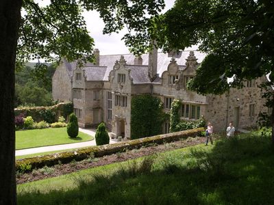The stone-built mansion features tall chimneys, ornate decorative plasterwork, intricate glass windows, and multiple period rooms displaying Tudor and Elizabethan architecture.