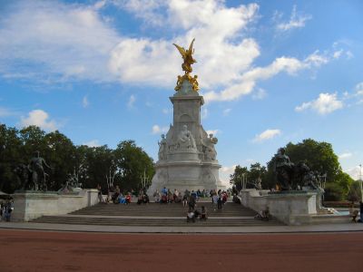 The Victoria Memorial is a Beaux-Arts monument made of white marble, standing in front of Buckingham Palace in the City of Westminster. The structure features a central column with bronze sculptures representing different virtues, set on a large base with water basins and decorative figures along the sides.