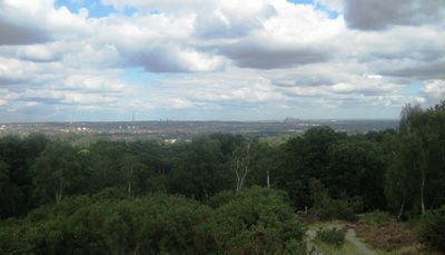 The 130-acre hills reach 460 feet above sea level, featuring London's largest heathland area surrounded by woodlands on a gravel bed.
