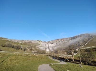 During extreme rainfall in December 2015, water cascaded over the cliff edge, temporarily creating England's highest single-drop waterfall at 80 meters.