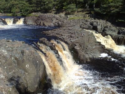 The waterfall measures approximately 18 feet in height but creates a dynamic spectacle through its series of stepped falls cascading over the ancient Whin Sill formation.