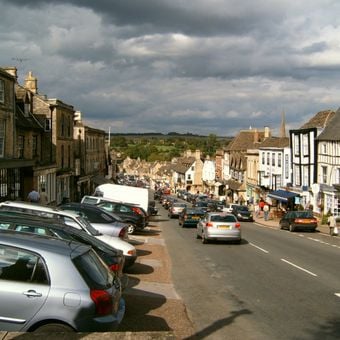 Burford is a medieval town in West Oxfordshire that follows the course of the River Windrush, with limestone buildings characteristic of the region. The High Street slopes downward toward the river, where historic structures frame the town's layout and crossing point.