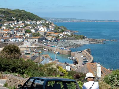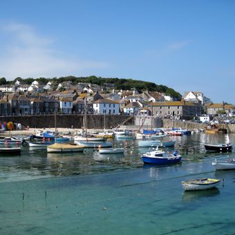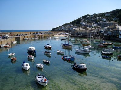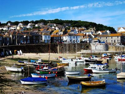 The granite houses of Mousehole form a circular pattern around a protected harbor with two substantial breakwaters safeguarding the settlement against ocean forces.