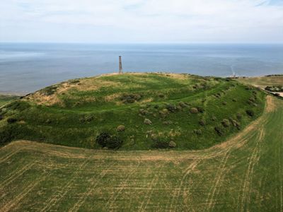 The summit of Pen Dinas rises high above the Welsh coast, featuring extensive fortifications that extend across both its northern and southern peaks.