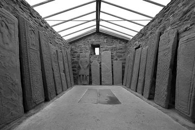 The stones remain protected inside a purpose-built shelter constructed in 1956, allowing visitors to examine the detailed medieval carvings throughout the year.