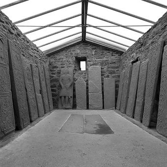 The Kilmartin Stones collection includes 79 ancient graveslabs with detailed carvings of swords, crosses, animals, and decorative patterns at Kilmartin parish church.