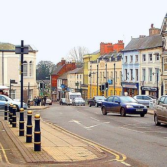 Lutterworth is a market town in Harborough positioned at a crossroads of major transport routes, with the M1 motorway to the east and the A426 road linking Leicester to Rugby. The town center retains its traditional market layout with shops and buildings surrounding the historic church.