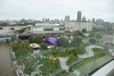 The landscaped space extends across numerous mature trees and green lawns next to the River Thames, near the London Eye observation wheel.