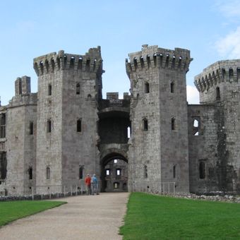 Raglan Castle is a fortress in Monmouthshire featuring a distinctive hexagonal tower constructed between 1435 and 1550. The structure combines stone quarried from Redbrook with Bath Stone, rising from grounds once protected by moats and defensive walls.