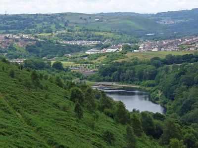 The county borough spans across steep valleys formed by the River Taff, with an elevation reaching 389 meters at its highest points.
