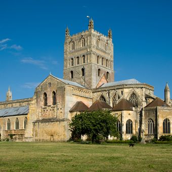 Tewkesbury Abbey is a Norman stone church in Tewkesbury, England, with a tower and walls built from Caen limestone. The interior holds medieval tombs, windows, and structural elements from several centuries of English religious history.