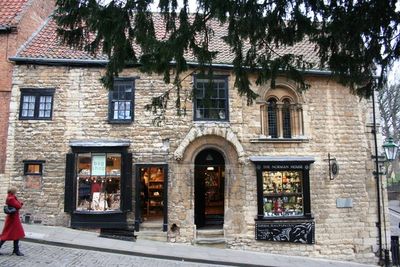 The historic building currently operates as a tea merchant shop and stands near other medieval structures, including St Mary's Guildhall.