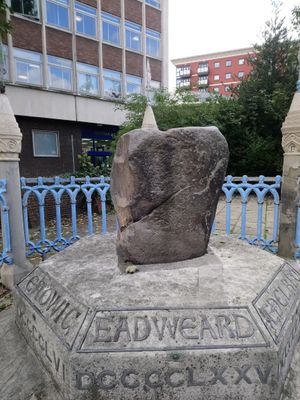 The stone represents the early English monarchy, with metal inscriptions of each crowned ruler's name embedded in the granite base.
