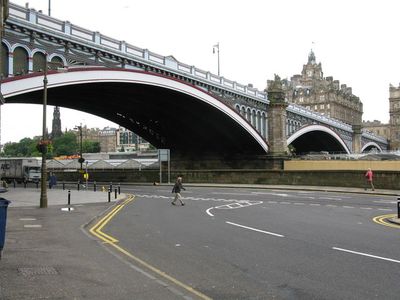 The North Bridge spans 525 feet with three steel arches connecting Edinburgh's High Street to Princes Street across the Waverley Station railway tracks.