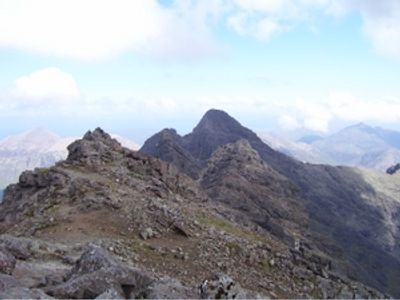Bruach na Frìthe rises to 958 meters (3,143 feet) in the Black Cuillin range with exposed gabbro rock that creates rough, grippy surfaces ideal for mountaineering. The mountain forms a prominent pinnacle along the ridge with steep sides dropping away on most approaches.