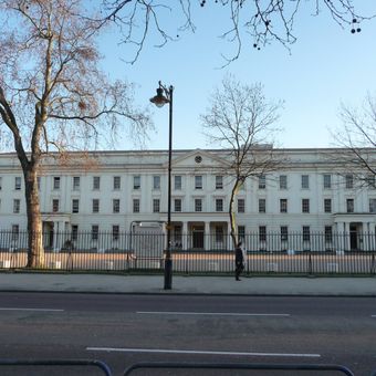 The Wellington Barracks complex stretches between Birdcage Walk and Petty France, featuring classical architectural elements and a central parade ground.